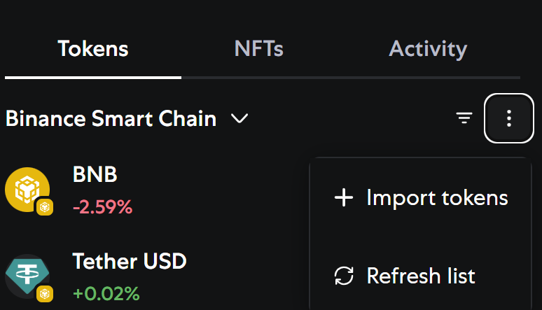 - Binance Smart Chain текстний баруун талд байрлах гурван цэг бүхий меню дээр дарж + Import tokens товчийг дарна.