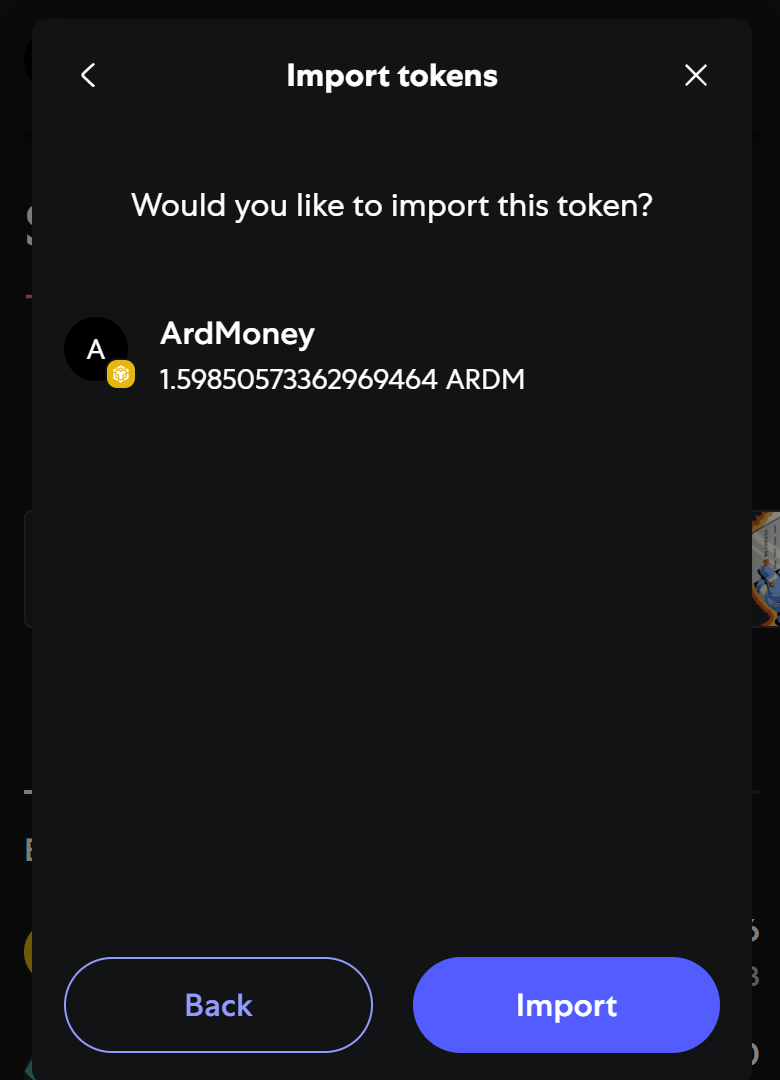 - Дараагийн цонх дээр таны эзэмшиж буй ARDM хэмжээ харагдаж Import товчийг дарснаар таны метамаск хэтэвчинд харагдана.