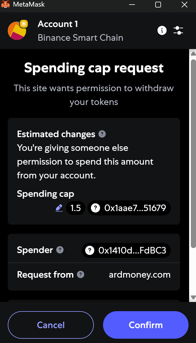 - Баталгаажуулах товчийг дарна. Метамаск автоматаар Spending cap request дэлгэцийг харуулах ба доор байрлах Confirm товчийг дарна. “Токен баталгаажлаа” гэсэн цонх сайт дээр гарч ирнэ.