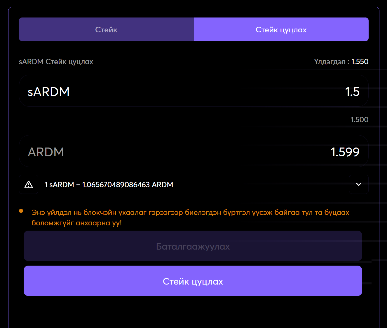 Хэрхэн ardmoney.com дээрээс стейк цуцалж, метамаскаас гаргах вэ?